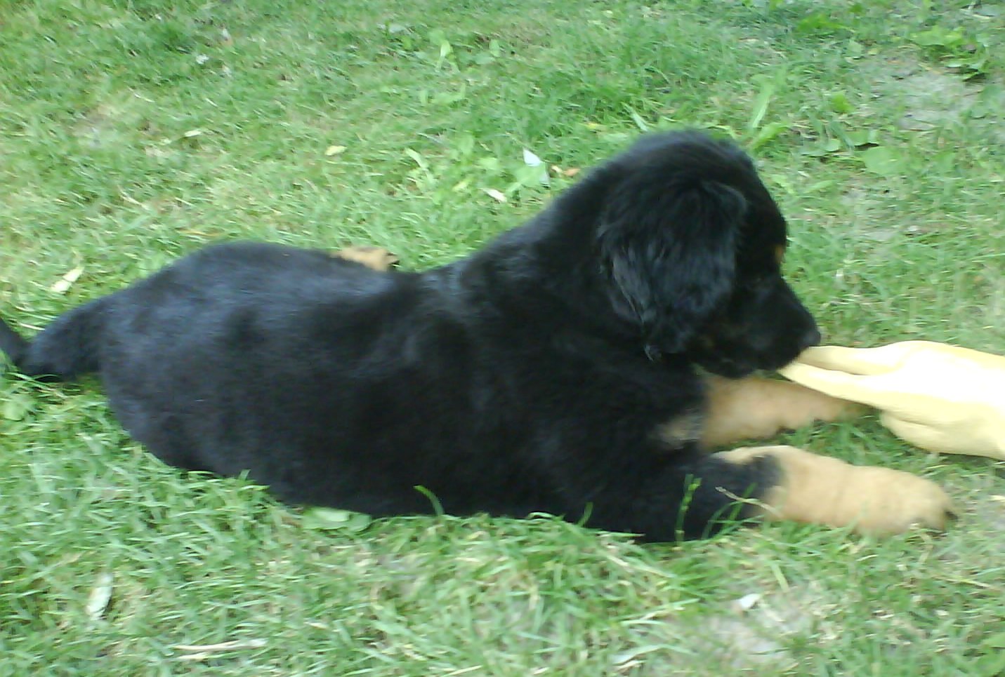 V sobotu jsme opět zavítali do Veřovic, kde nás čekali už jenom dva kluci - Mac, kterého na podlední chvíli zájemci odřekli a Mefist, který zůstane u mámy. Oba kluci byli zrovna na zahrádce, kde nás bouřlivě uvítali, zejména taťku. Mac se ukázal jako pohotový lapka, nejdřív se zmocnil obalu na foťák (o který vzápětí svedli bráchové boj), potom ukradl naše vodítko a nakonec se pokoušel odtáhnou tašku, ale to hoch přecenil svoje síly. Z Badyho jsme potom na procházce (spíš plavbě všudypřítomnými močály) udělali krásného plavoznakáče a ke štěňatům jsme se vrátili zrovna při návštěvě dalších zájemců o plaváčka. Bady se ukázal v celé své krásné špinavosti a bez mrknutí oka vydržel dlouhý přímý pohled z očí do očí (ze vzdálenosti 20 cm) nového majitele Maca. Ukázku pohodového charakteru hovíka dovršil tím, že si uprostřed kruhu devíti diskutujících hodil nerušeného šlofíka. Krátce po odchodu zájemců jsme se dojatě a opět bouřlivě (oba bráchové jsou neskuteční mazlové) rozloučili a odfrčeli na druhou stranu kopce.